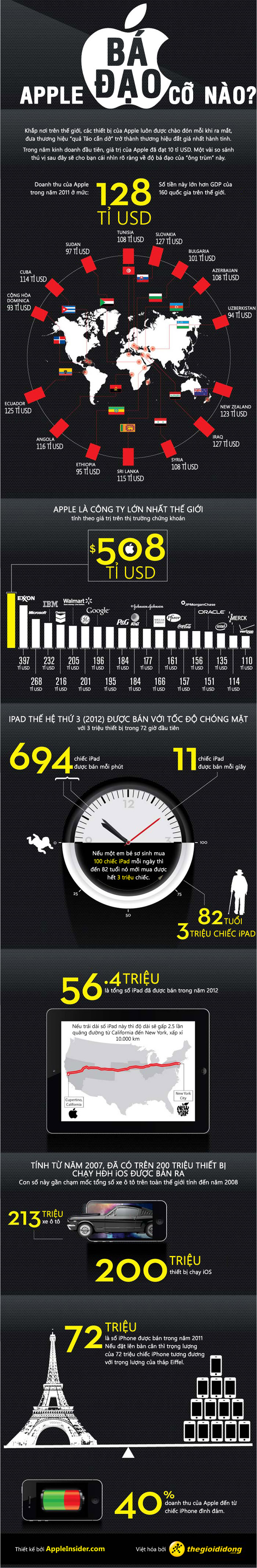 Chừng đó thôi đủ thấy thế lực của Apple hùng mạnh cỡ nào. Infographic dưới đây sẽ cung cấp thêm cho bạn những thông tin thú vị về “quả Táo cắn dở” mà ai cũng thèm muốn này.