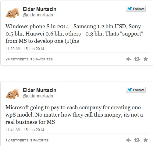 Blogger nổi tiếng người Nga Eldar Murtazin đã tiết lộ số tiền mà Microsoft hỗ trợ cho các nhà sản xuất khác để họ sản xuất những smartphone chạy Windows Phone. Theo đó, Microsoft đã bỏ ra hơn 2,6 tỉ USD cho các nhà sản xuất smartphone bao gồm Samsung (1,2 tỉ USD), Huawei (600 triệu USD), Sony (500 triệu USD) và các nhà sản xuất khác (300 triệu USD).