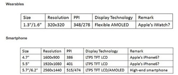 Ngoài ra DisplaySearch cũng dự đoán rằng đồng hồ thông minh Apple iWatch sẽ được trang bị màn hình AMOLED. DisplaySearch cho biết chiếc đồng hồ này sẽ mang theo một màn hình AMOLED dẻo 1,3 inch hoặc1,6 inch với mật độ điểm ảnh dao động từ 348ppi đến 278ppi. Máy tính bảng khổng lồ iPad Pro cũng được DisplaySearch cung cấp thông tin cho thấy nó sẽ có màn hình 12.9 inch với độ phân giải 2732 x 2048 pixel tương đương với mật độ điểm ảnh 265ppi.